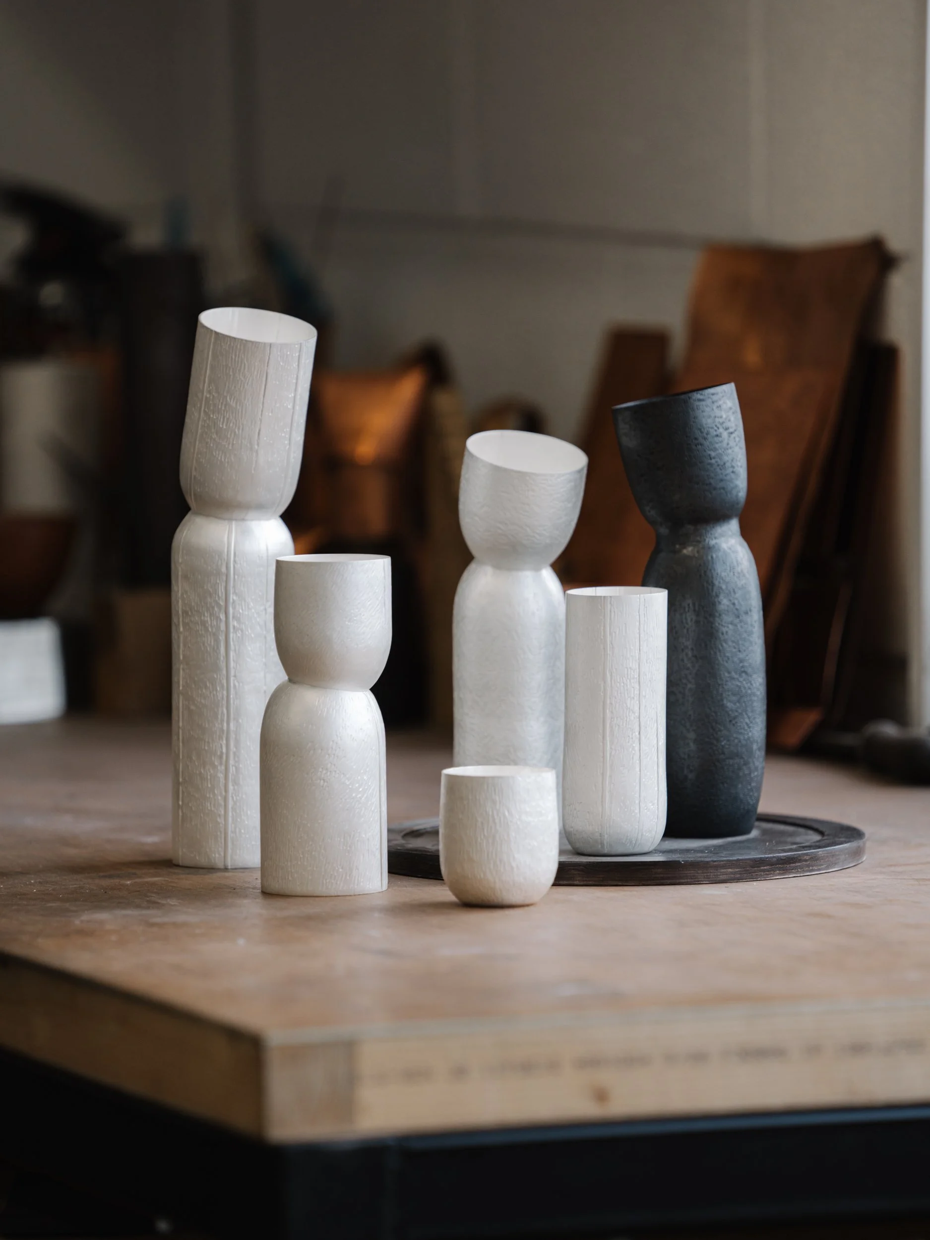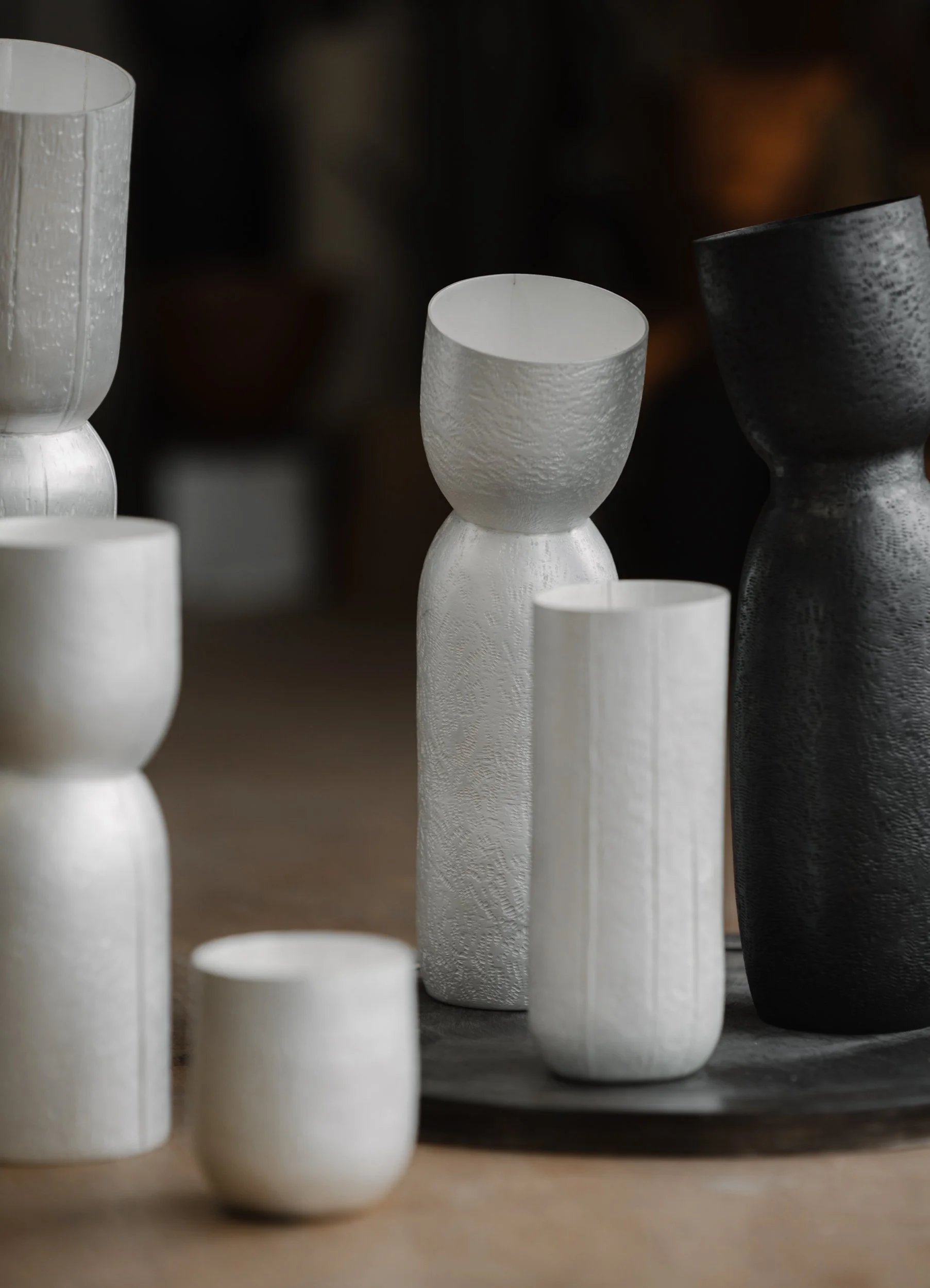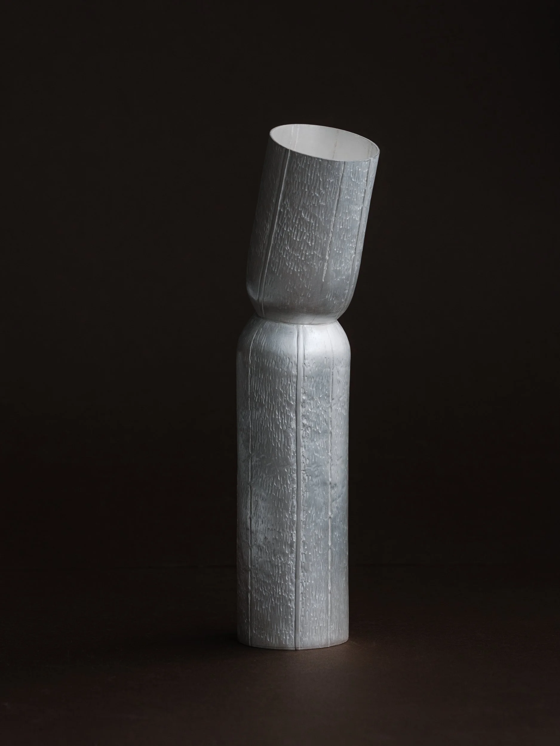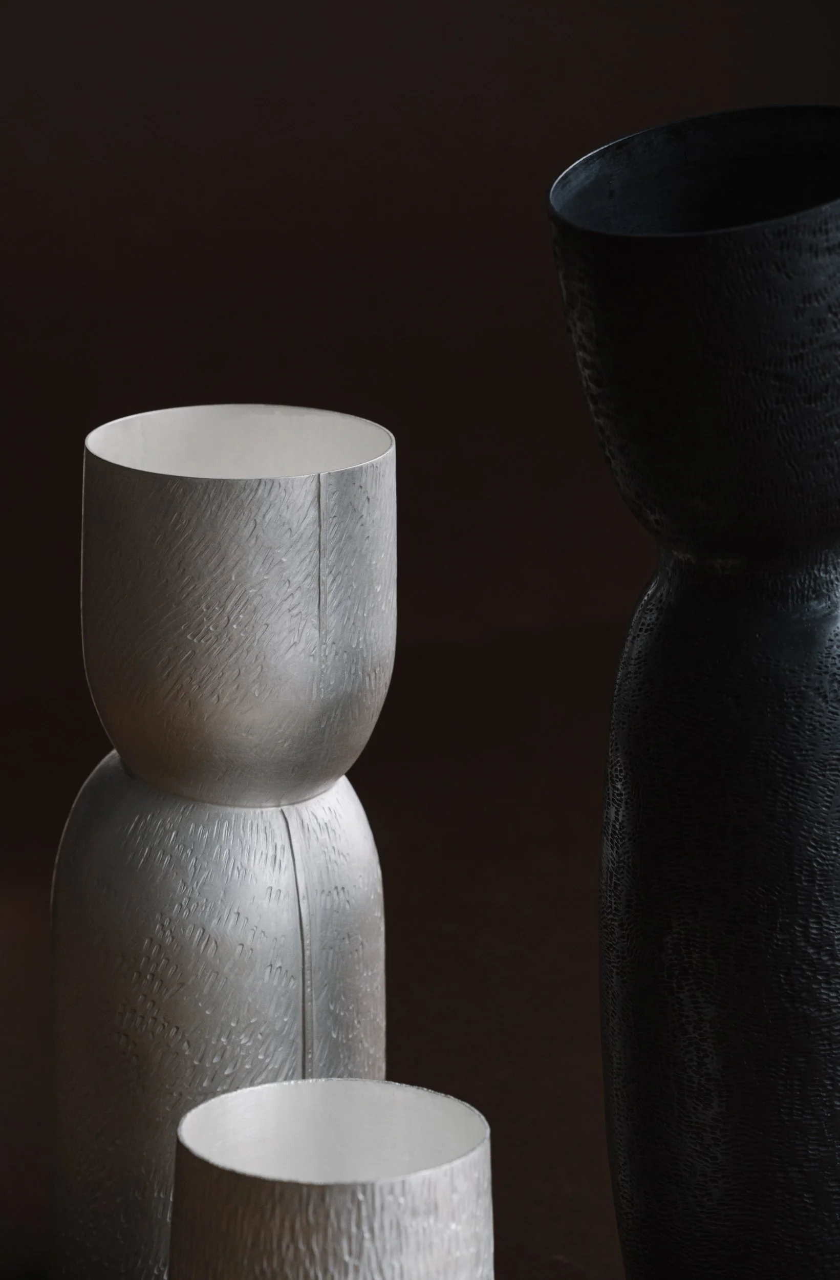 Figurative vessels and objects are formed using various fabrication techniques. Characterised by vulnerably precarious postures, complementary and mirrored silhouettes are enhanced by a dark oxidised finish. The objects lean into each other as if in conversation, sitting in a sombre scenery of tactility.